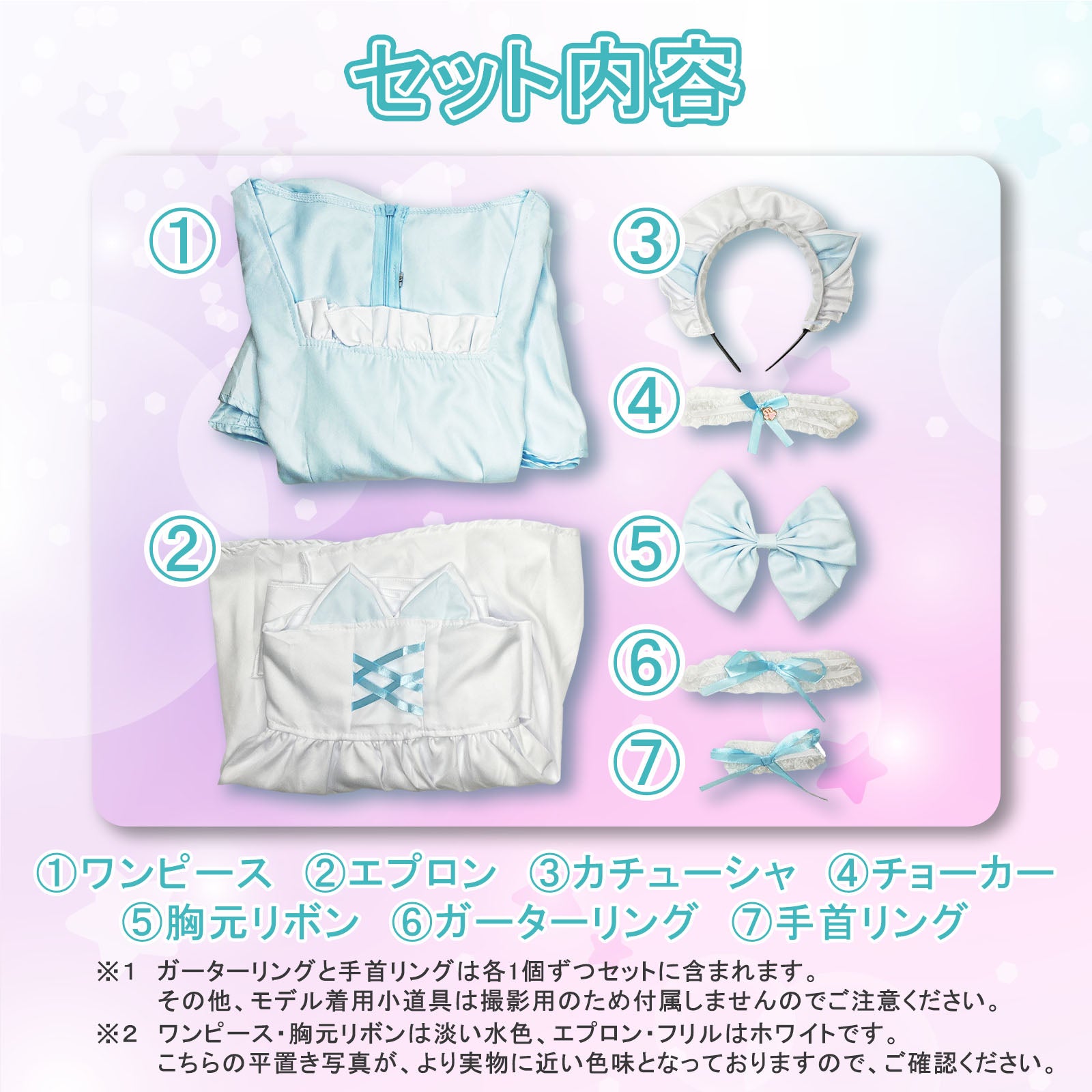 【セット内容】ワンピース+エプロン+カチューシャ+胸元リボン+チョーカー+ガーターリング+手首リング